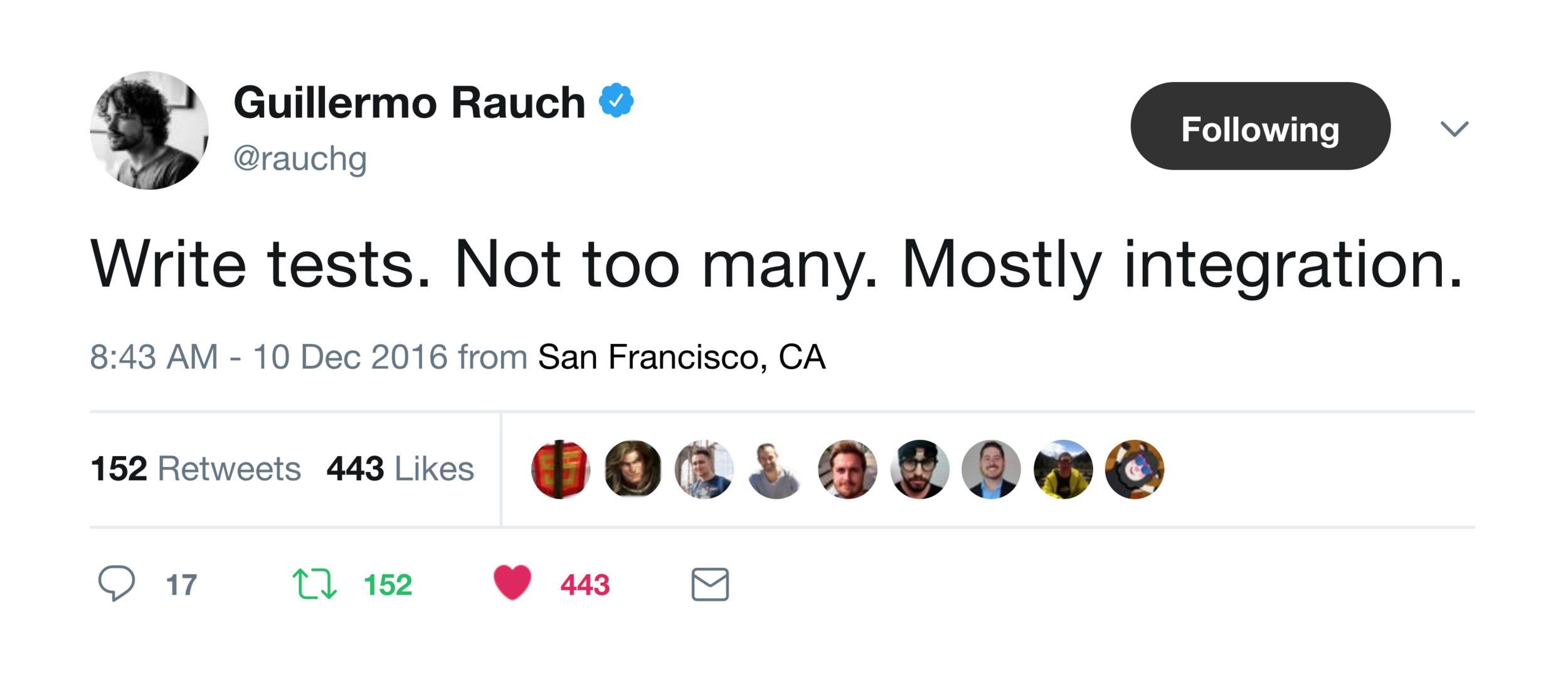 - "Write tests. Not too many. Mostly Integration."ย (My blog post version)