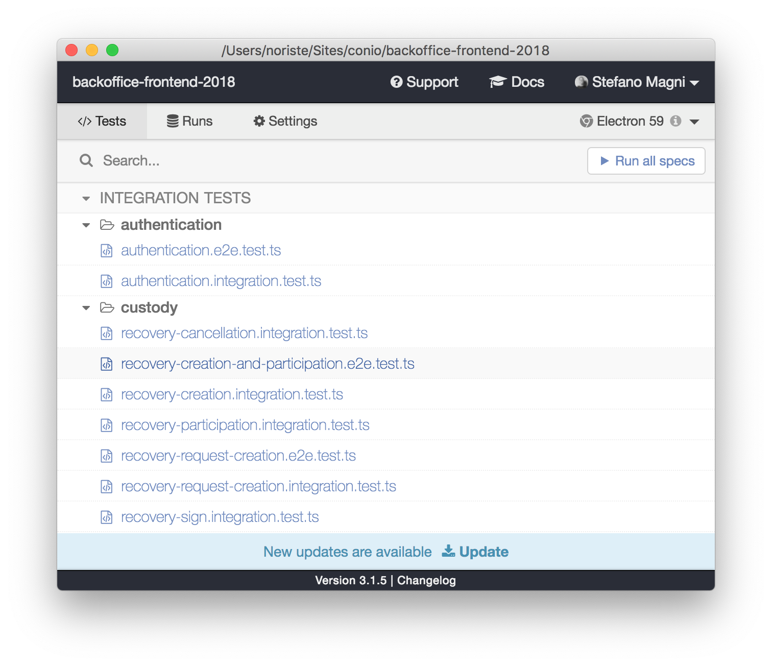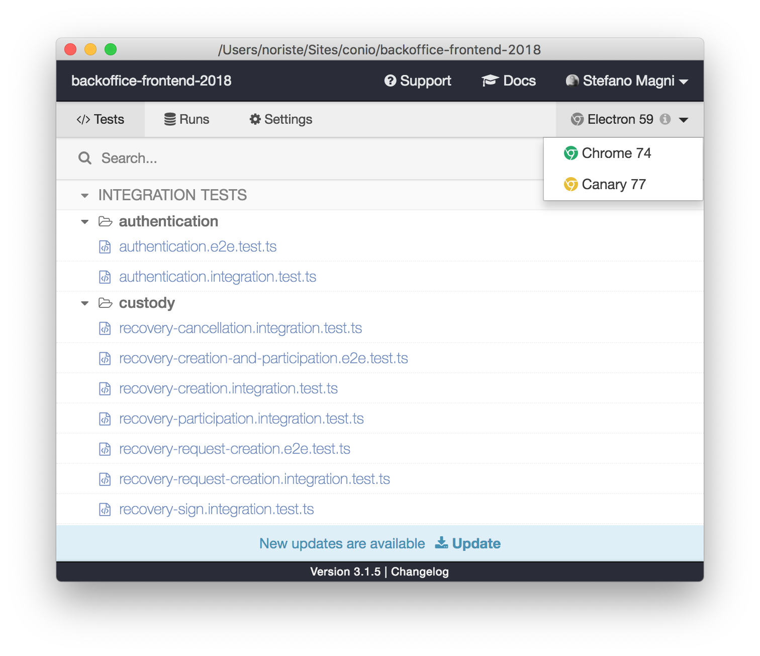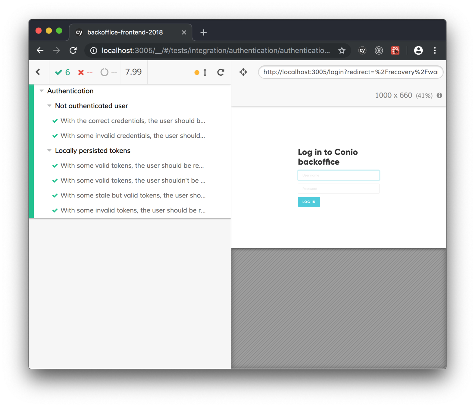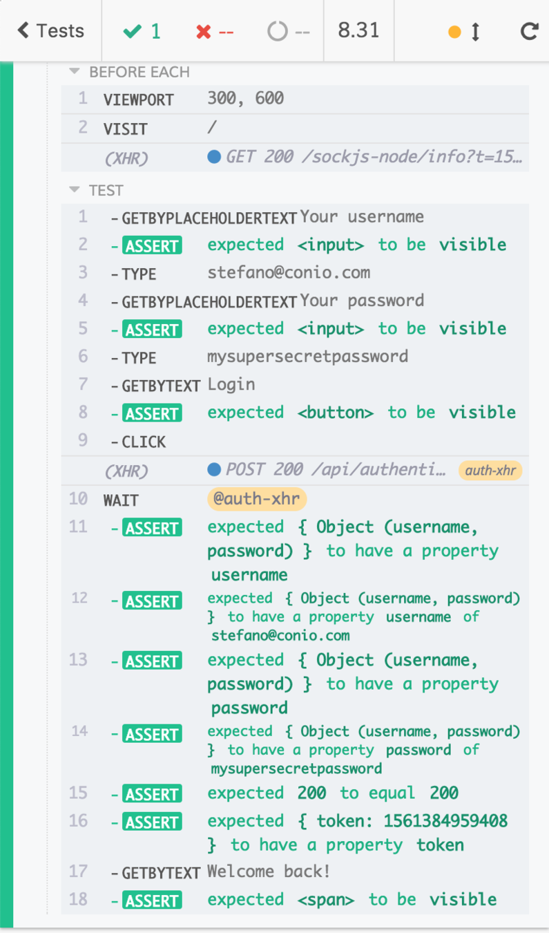 cy.get(".btn-primary").click()* the Conio's back office test suite is composed by 80 UI integration tests and 12 E2E tests
